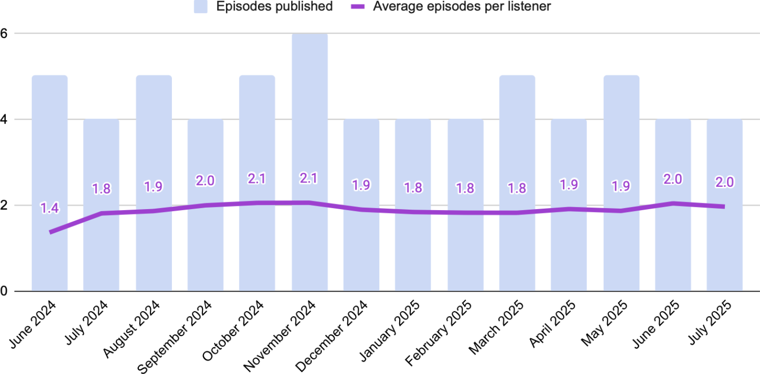 On its own, the average number of episodes per listener is an interesting bit of trivia. But this number quickly becomes actionable once compared to a show's publishing volume.