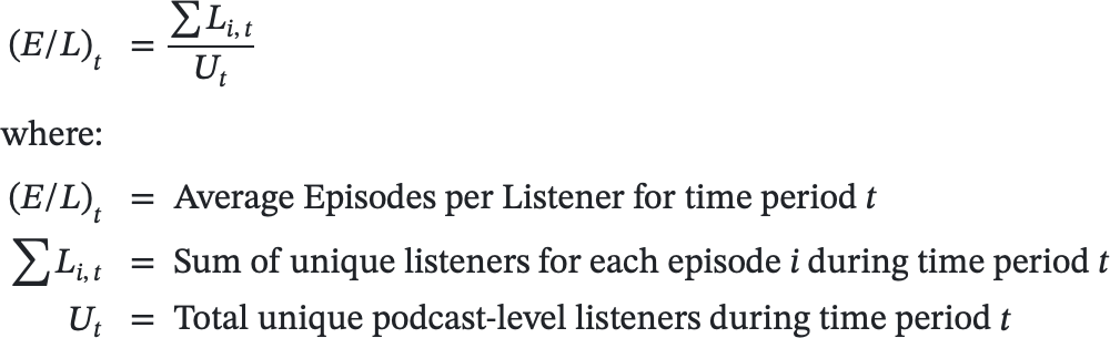 Average episodes per verified listener is a derived metric, meaning it's calculated from other core metrics provided by platforms like Apple and Spotify. The key ingredients we use are: