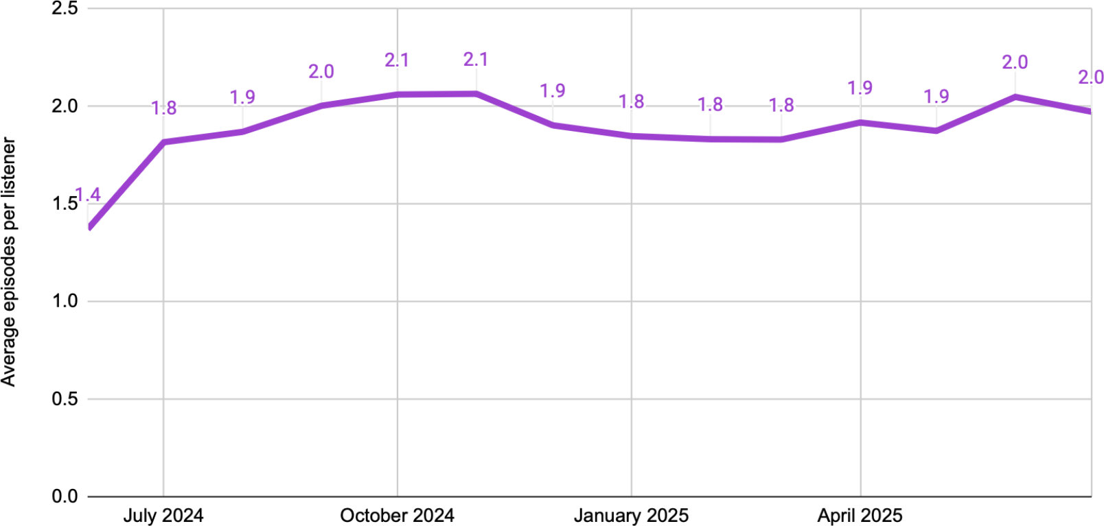 In its first month, the average number of episodes per monthly listener was 1.4. Over the next few months, that average rose to around 2, where it's remained steadily ever since. This makes intuitive sense: early on in the show's life, there were plenty of "one and done" listeners who checked out a single episode of the show, pulling the average down.
