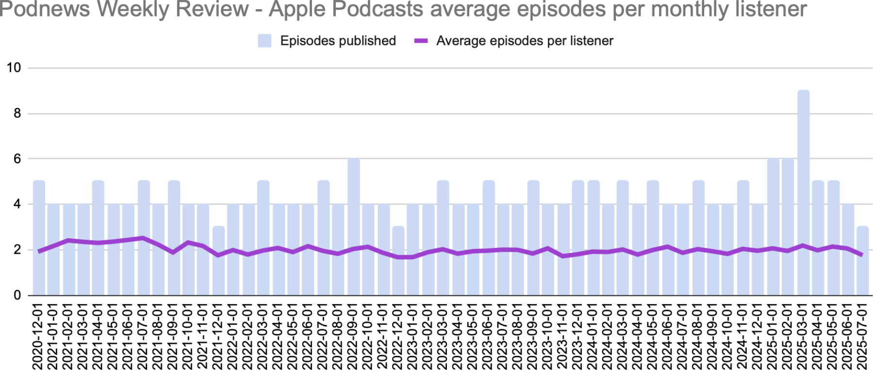 Switching to a less-frequently published show, an analysis of Podnews Weekly is probably best suited to monthly resolution, given that it publishes multiple episodes per month. Like with the daily show, we see similar numbers over time, with the average Apple Podcasts listener playing roughly 2 episodes per month: